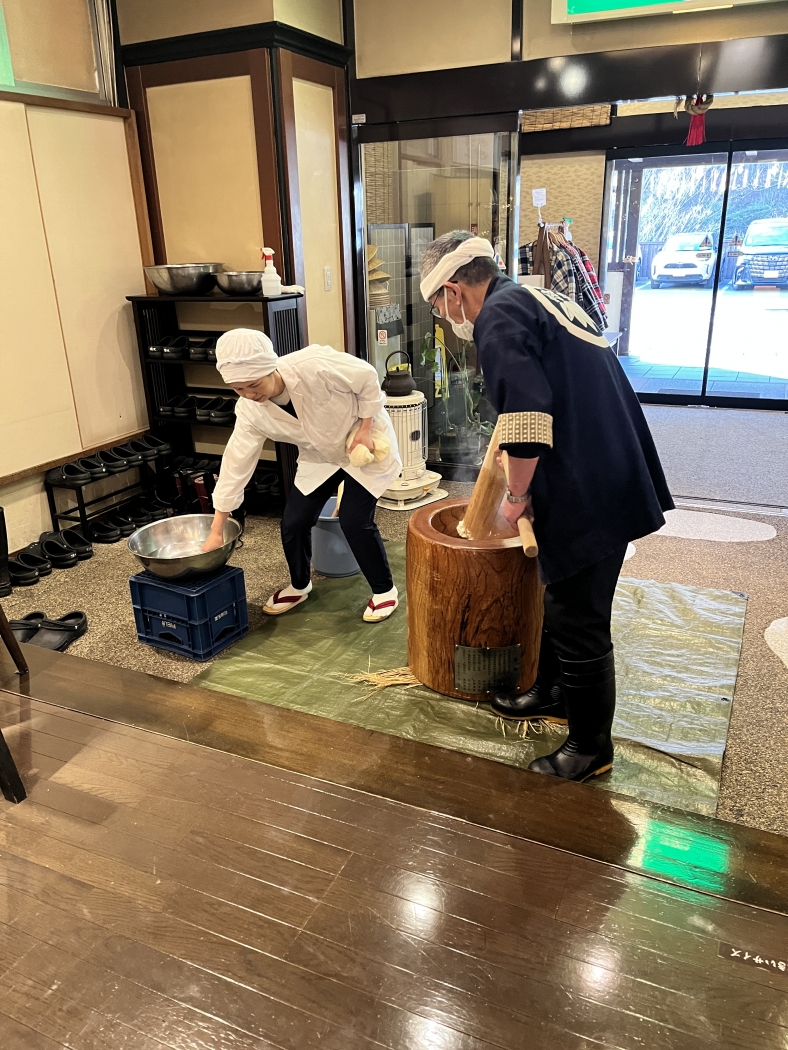 恒例新春お餅つき ヨイショの掛け声と共に、お餅をつきます。 お客様にも手伝ってもらい美味しく仕上がります。 つき上がったお餅は、柔らかく美味でございます。